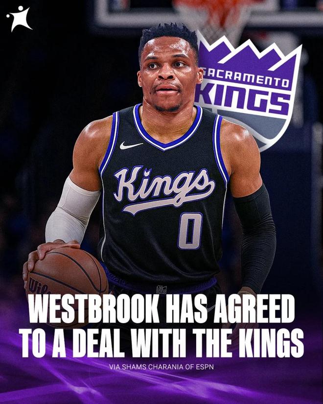 “准37岁”的拉塞尔·威斯布鲁克(1988年11月12日)在漫长的等待后,终于找到了NBA生涯的下一站,据ESPN知名记者ShamsCharania报道,九届全明星球员威斯布鲁克已经同意加盟萨克拉门托国王队,这位2017年的MVP得主即将迎来他的第18个NBA赛季,在自由市场徘徊125天后,这位历史三双王终于敲定下家,与国王达成了一份一年360万美元的老将底薪合同,预计将于近日正式签约并加入球队