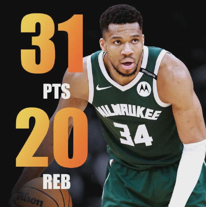 在38分钟的出场时间内,字母哥运动战14投11中,三分球也有2投全中,在罚球线上更是12罚7中,独得31分20篮板7助攻1封盖,其中有7个前场篮板。