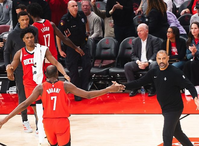 本场比赛看清五大事实。第一,为什么乌度卡坚持要上五大阵容?其实卡佩拉也好,亚当斯也罢,就是解放申京,让申京有更多空间处理球,同时缓解对抗和护框压力。本质上是好的,但效果太差了。第二,火箭五大阵容为什么效果差?内线拥挤!从上半场最后两分钟就能看出,亚当斯往篮下一战,阿门突破和空切空间没了,申京和杜兰特也进不去,只能在低位背筐,对面随便包夹,这就导致失误频出。特别是杜兰特,越打越上头。因为火箭就没有真正的组织控卫,打挡拆还好,关键谁来发起?
