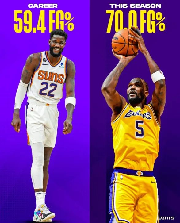 要知道,即便是“天勾”贾巴尔,其湖人时期投篮命中率最高的一个赛季为60.4%;即便是最具统治力的“大鲨鱼”奥尼尔,其湖人时期命中率峰值是60.0%;即便是在现代篮球中同样以高效著称的安东尼·戴维斯,其单赛季最高命中率也未超过55.0%。