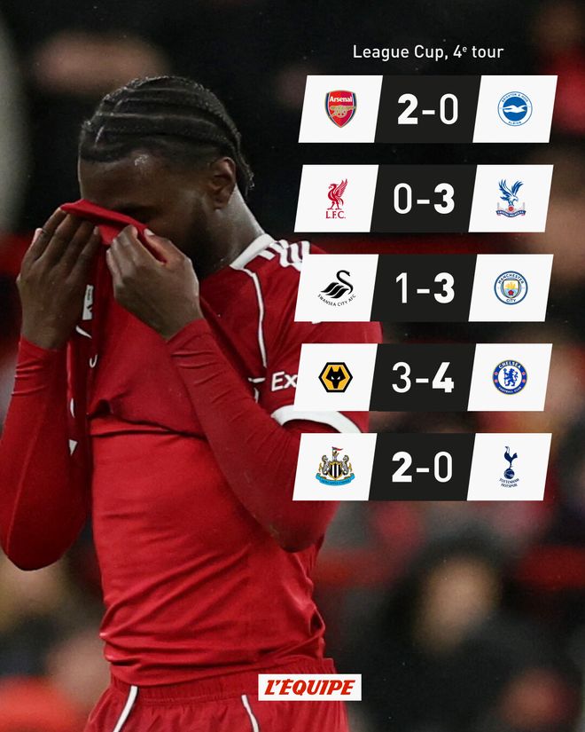 在英联杯第4轮的较量里,阿森纳以2-0轻取布莱顿、客场以3-1逆转斯旺西、切尔西以4-3逆转狼队,这三队皆顺利获得晋级资格。热刺以0-2不敌纽卡斯尔联、利物浦以0-3完败于水晶宫,这也宣告出局。至于曼联,早在次轮时,便在点球大战不敌英乙的格林斯比宣告出局。